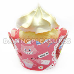 12 cupcake wraps featuring Alice in Wonderland and the White Rabbit - reverses to pink with teacups & teapots..