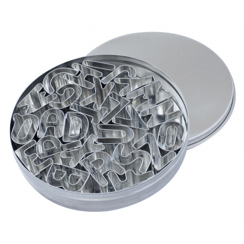 This alphabet cutter set includes 26 stainless steel cutters (A-Z) each measuring approximately 25mm. Each cutter has a a rigid cutting edge on one side and a rounded top for hand comfort. Great for baking, cake decorating, cookie making, craft and more. Comes in a 12cm diameter tin case.
