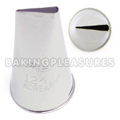 This Rose Petal Medium Piping Tip #124 by Ateco is a large petal tip for piping roses, sweat peas, rosebuds, daffodils, daisies , ruffles, bows, and more. Ateco tip #124 can be used with a medium coupler. Made out of stainless steel. Not dishwasher safe.