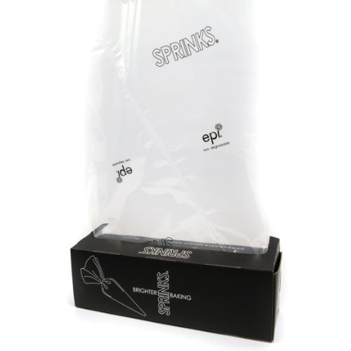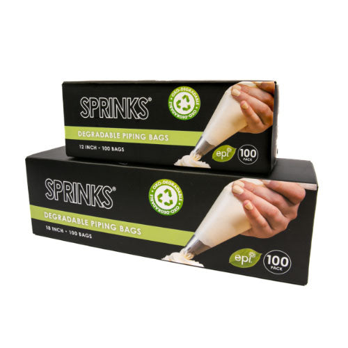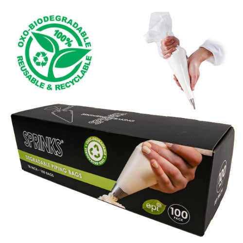 These biodegradable non slip disposable piping bags by Sprinks are a great choice for the environmentally conscious. These piping bags are made from 100% OXO biodegradable (EPI) material and the box from recyclable paper. Features an anti slip coating allowing you to stay in control when piping. Save time cleaning with disposable, affordable piping bags. Suitable for all cold, hot, light and heavy food and cake fillings. Can be used with most soft mixtures, icings, creams, pureed vegetables and more. Bags can be cut to fit all tube/tip sizes and couplers. Comes in a box of 100x 18 inch (45cm) biodegradable piping bags.
