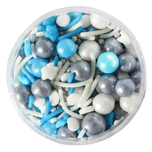This Bulk Sky Full of Stars Sprinkle Mix by Sprinks includes a mix of blue, white and grey pearls, jimmies, confetti, star sprinkles. Great for decorating cakes, cupcakes and desserts. Comes in a 500g zip lock bag. Also available in 65g jars.