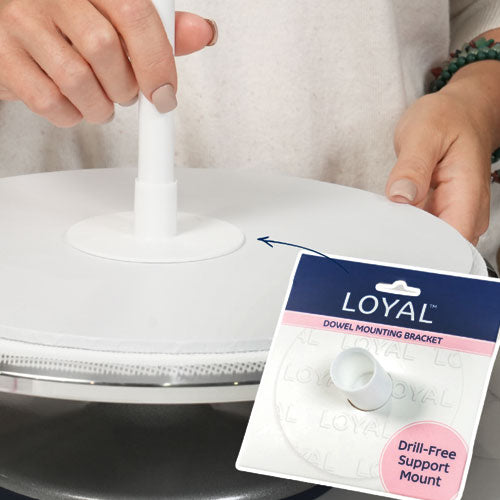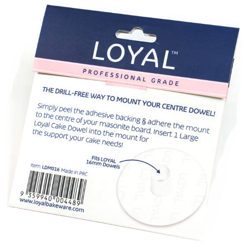 This Cake Dowel Mounting Bracket by Loyal features a drill-free way to mount your centre dowel! Simply peel the adhesive backing and adhere the mount to the centre of your masonite board. Insert 1 Large Loyal Cake Dowel into the mount for the support your cake needs!