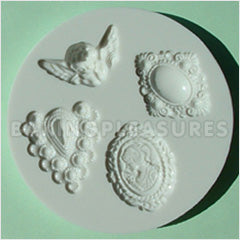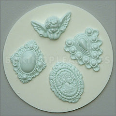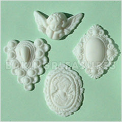 Easily create cameo decorations using this cameo sugarcraft silicone mould. There are 4 different designs. Sugarcraft Silicone Mould measures 75mm. This sugarcraft silicone mould is made out of a silicone system specially formulated for use in food and confectionary and complies to FDA regulations. This cameo sugarcraft silicone mould is ideal for use with flowerpaste, sugarpaste, marzipan and more.