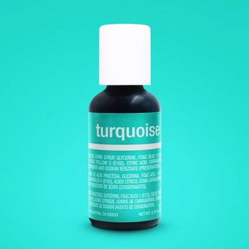 This Chefmaster Liqua-Gel Turquoise is a highly concentrated, vibrant food colouring that mix easily and provide consistent tones without altering the texturing of your product. Colours are intense, bright and vivid. Easy to mix and disperse instantly. Gels come in 0.7oz (20ml) squeeze bottle with twist-top lids, so you can add drops for easy-to-repeat colors every time. Use in whipped icing, buttercream, fondant, cookies, and more.