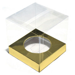 This clear cupcake box with gold inserts is a great way to package a single cupcake. It's transparent clear style allows your cupcake to shine through. Each clear box is wrapped with a protective film. Includes gold inserts to ensure your cupcakes arrives in great shape. Clear cupcake box measures approximately 9cm x 9cm x 9cm. Insert hole measures approximately 6cm and will fit a standard size baking cups with a base of 5cm. Each pack contains 24 clear cupcake boxes with protective film and 24 gold inserts. Buy in bulk and save. Product supplied flat pack. Ribbon & cupcake not included.