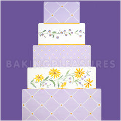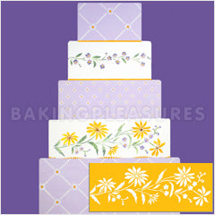 This Daisy And Forget Me Not Side Cake Stencil by Designer Stencils is cut using precision lasers and are made out of heavy duty plastic for high-quality, professional, repeat use. It can be used with airbrush, luster dust, buttercream and royal icing. Measures 3.8"H x 11.6"W.