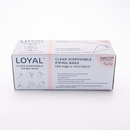 LOYAL Disposable Piping Bags are crafted to meet the highest standards of baking! Our disposable piping bags offer a dual density, non-slip exterior, whilst featuring a smooth interior for consistent piping and exceptional durability! Perfect for both light and heavy fillings, you don't have to worry about your piping bag splitting or ballooning.Â