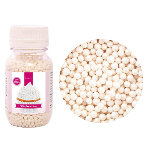 These edible pearls in pearlised white by Roberts Confectionery are great for decorating cakes, cupcakes and desserts. Edible pearls measures approximately 2mm - 3.5mm. Comes in a 115g bottle.