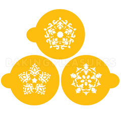 This five point rosettes stencil set by Designer Stencils features 3 elegant rosettes stencils. Each design fits a 2.75" circle. These stencils are great for stenciling cookies and can be used with airbrush, luster dust, buttercream and royal icing. Made out of high quality 10 mil food grade plastic. Made out of high quality 10 mil food grade plastic. Instructions included.