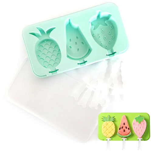 aThis Fruit Popsicle Silicone Moulds by Cake Craft is ideal for creating a Fruit shaped edible treats. Features 3 cavities Pineapple, Watermelon, Strawberry. Food-Safe Silicone. Dishwasher Safe