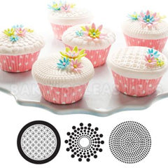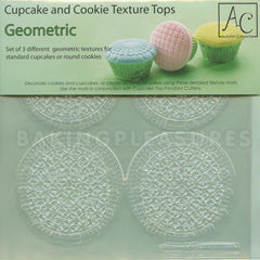 These Geometric Cupcake & Cookie Texture Tops are great for imprinting detailed geometric textures onto rolled fondant or other rolled icing for cookies and cupcakes. This geometric texture top set contains 3 mat each mat imprinting the same flower design four times. Mat measures 7 5/8 inches imprinting designs measuring 3 1/4 inches. Both sides of the mat can be used one side giving raised impression and the other recessed impression. Instructions included.