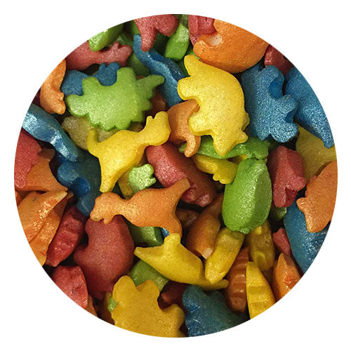 These dinosaur shaped edible sugar sprinkles in glimmer rainbow colours blue, yellow, green, red and orange are great for decorating your dinosaur themed party cakes, cupcakes and desserts Comes in a 80g self seal pack.