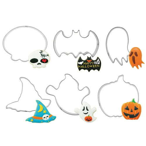 This Halloween cookie cutter set includes 6 ookie cutters in halloween themed shapes. This set contains a witch hat, ghost, pumpkin, skull, spooky ghost & bat cookie cutter.