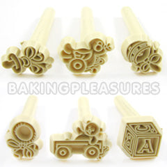 This Holly Embosing Sticks Nursery set contains 6 pcs -bear on wheels, teething ring, abc block, soother, rattle, pull along duck. Use these embossing sticks to emboss small patterns on your work. 45mm sized barrel/stick. Made in England.