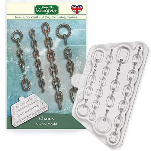 This Chains Silicone Mould by Katy Sue helps you easily make a detailed chains for your under the sea themed cakes. The depth and detail of this chains mould is incredibly realistic. The chains are perfect for adding on to the end of an anchor or for creating borders on your craft projects and for decorating craft projects. The mould has 4 links and 4 chains giving you 8 individual elements to play with.