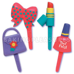 These colourful Little Girl Cupcake Picks are an easy and cost effective way of decorating your cupcakes or desserts. Simply stick one of these onto your cupcake and you are ready to go. Each pack contains 12 Little Girl Cupcake Picks randomly picked. There are four different designs in this set (purse, nail polish, ribbon & lipstick). Not edible.