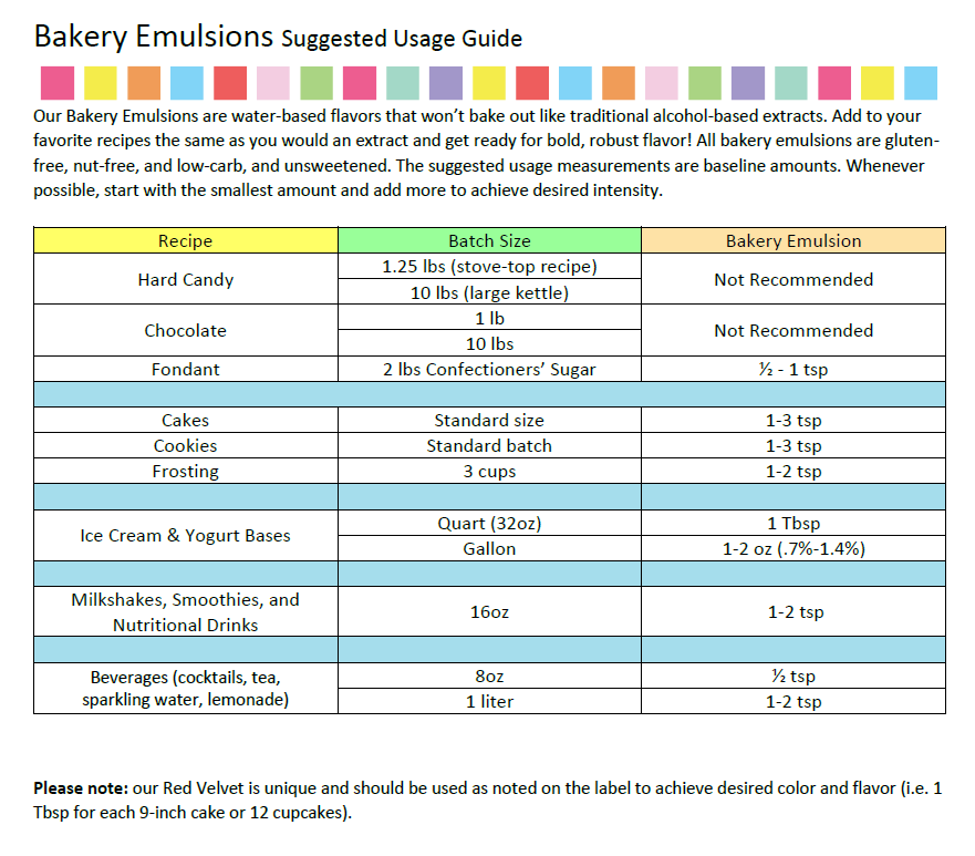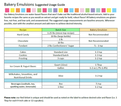 Lorann Bakery Emulsions are water-based flavours that won't bake out like traditional alcohol-based extracts. These flavourings are formulated to be the same strength as an extract, but instead of the flavour being diluted in alcohol, it is suspended in a water-base. Made in USA.