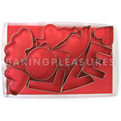 The perfect valentine cookie cutter set. Spell out your LOVE to your sweetheart. Comes in a box of 9 cookie cutters, 4 heart designs, LOVE & a dove. Packed in an attractive gift box with a clear lid wrapped with a ribbon.