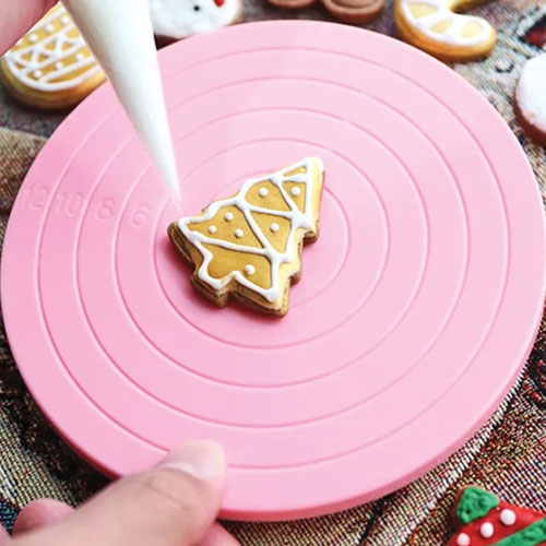 This Mini Turntable is a lightweight turntable that rotates 360 degrees. Made from food grade materials. Great for modelling and decorating cookies, cupcakes and smaller cakes.
