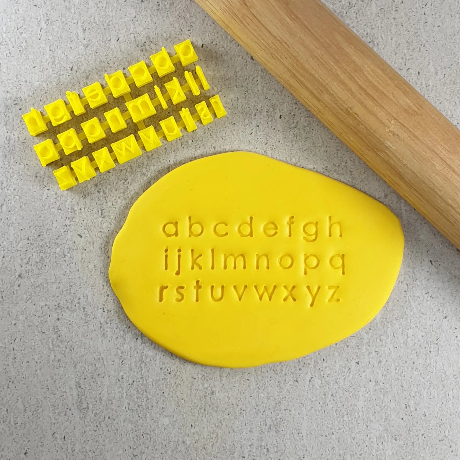 Upper case letters are 9mm tall. Lower case letter are approximately 7mm tall. Letters can be stamped up to 4mm into your fondant.