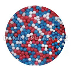 Dress up your cakes, cupcakes & desserts in red, white and blue with these teeny tiny balls of sugar also known as non pareils. Packaged in a convenient 113g shaker bottle sealed for convenience. Made in USA.
