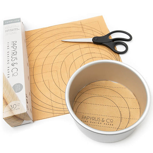This quality non stick templated baking paper by Papyrus is a great way to save paper and time. Baking paper has cutting guides for both square and round tins from 4 to 12 inches. Each roll contains 100 templates. Measures 30cm width and 25m length.