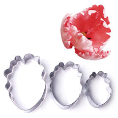 This parrot tulip flower cutter set us great for cutting out parrot tulip flower petals out of gum paste, sugar paste, rolled fondant, marzipan and craft clays. This set includes 3 stainless steel parrot tulip petal cutters measuring approximately: