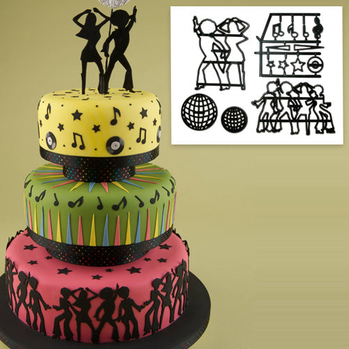 Create retro disco themed decorations for your disco cakes and cupcakes using this Patchwork Cutters Disco Dancers cutters and embossers. This disco themed set includes: