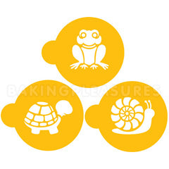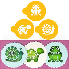 This Pond Critters Stencil Set by Designer Stencils is a highly detailed stencil made out of heavy duty plastic for repeat use and cut using precision lasers. This set includes a loveable snail, frog and turtle stencil. Stencils are sized to fit within a 2.5 inches circle which makes it perfect for 3 inches cookies. This stencil can be used with airbrush, dust, buttercream and royal icing. Made out of high quality 10 mil food grade plastic. Instructions included.