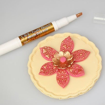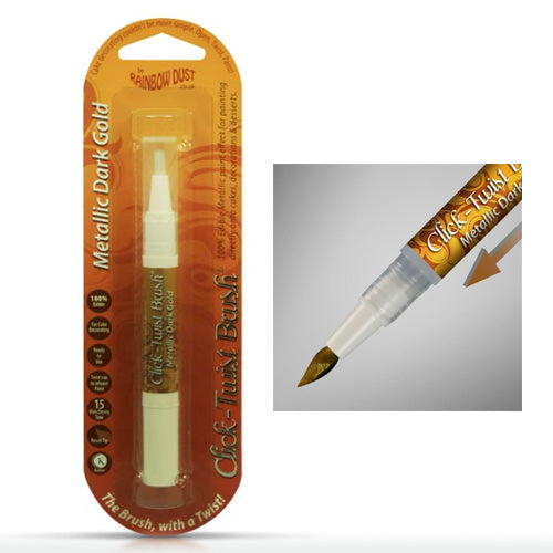 This Edible Click Twist Brush Metallic Dark Gold by Rainbow Dust is a convenient paint brush pre-filled with Rainbow Dust popular metallic food paint. To use simply twist the end cap of the brush until the paint fills the brush tip. When not in use, simply wipe excess paint from tip of brush and place the cap back over the brush until next time. Quick and easy. No mess no fuss.
