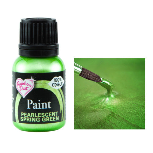 This Metallic Pearlescent Spring Green Food Paint by Rainbow Dust can be used on fondant, modelling paste, sugarpaste & flower paste. It can be applied using a small brush for detail work or using a spoonge or airbrush for larger areas. It is recommended to use an airbrush with at least a 0.35mm nozzle/needle. Comes in a 25ml bottle.