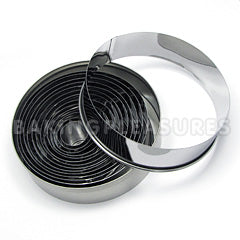 This stainless steel round cutter set contains 14 stainless steel round cutter ranging from 22mm - 112mm in width and are each 3 cm in height. Comes packed in a tin container.