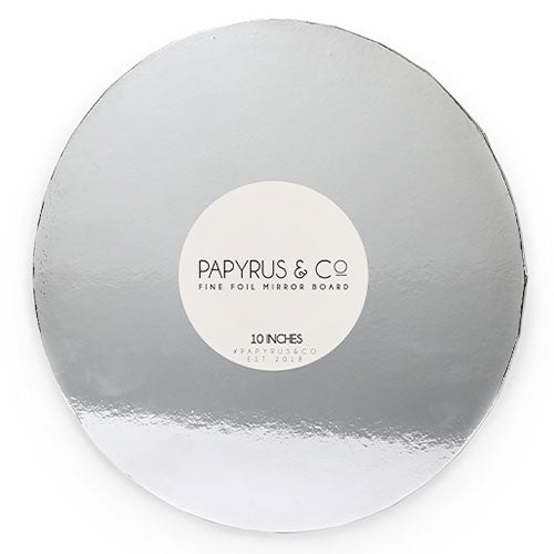 This Round Silver Mirror Masonite Cake Board 10 Inch by Papyrus is a masonite cake board covered in high quality silver foil creating a glossy mirror effect. Great way to present your food, cakes, desserts and have them elegantly reflected onto the board. Made out of 5mm thick masonite providing a strong base. Cake board measures 10 inches (25.4cm) in diameter. Each silver mirror cake board is individually shrink wrapped.