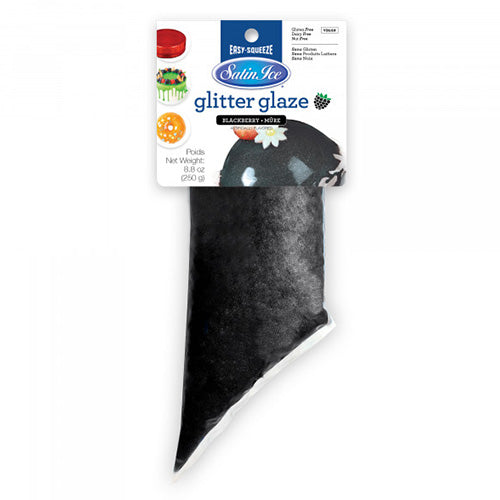 This Satin Ice Glitter Glaze Blackberry is great for adding a sparkly finish to desserts, cakes, doughnuts, cookies and so much more! With a bold black colour and delicious blackberry flavour, this ready-to-use glaze will transform any sweet treat. Comes in a convenient easy 250g squeeze pouch for drips and piping or can be used as a dip or to cover entire cakes. Simply cut the corner of the bag and squeeze!