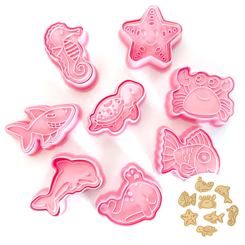 This sea ocean themed cookie cutter and embosser set includes 8 sea ocean cutters and stamps. Use the cutters to shape your cookie, then gently press the stamp into the dough to create imprinted detailing. Cutters measures approximately 5cm wide x 5cm tall.
