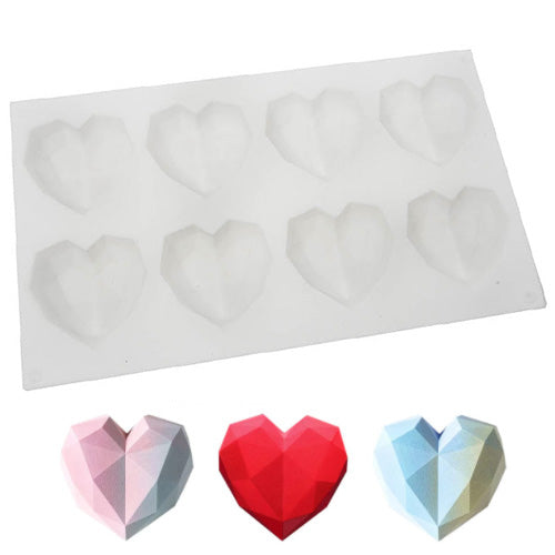 This Small Geometric Heart Silicone Mould has 8 cavities which allows you to easily mould detail 3D geometric heart shapes. It is made out of high quality food grade silicone. Features a nice balance between being firm enough to achieve detailed designs yet flexible for easy removal without damage. Great for fondant, gum paste, clay, chocolate and more.