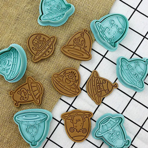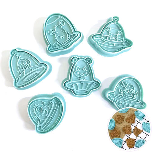 This Space Alien cookie cutter and embosser set includes 6 Space Alien themed cutter and stamps. Use these cutters to shape your cookie, then gently press the stamp into the dough to create imprinted detailing. Cutters measures approximately 4cm wide x 5.5cm tall.