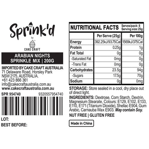 This Sprinkd Arabian Nights Bento Sprinkles features 6 different sprinkles in colours (black, white, gold, pink). Great for decorating cakes, cupcakes and desserts. Comes in a 200g clear container.