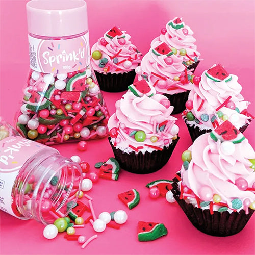 These Sprinkd Watermelon Sprinkle Mix features a mix of pearls, jimmies, watermelon sprinkle in green, white and pink colours. Great for decorating cakes, cupcakes and desserts. Packaged in a attractive 100g bottle.