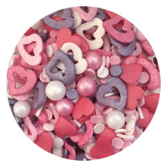 This lovely valentine sprinkle mix by Sprinkletti features a lovely mix of shimmering, co-ordinating, edible hearts, pearls, confetti & strands for adding a touch of glamour to your bakes. Each heart measures approx. 10mm. A mix of pink, violet and mother of pearl. Great for decorating cakes, cupcakes and desserts.Comes in a 100g resealable stand up bag for easy storage.