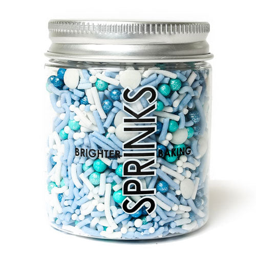 This Blue Ocean Sprinkle Mix by Sprinks includes a variety of sprinkle mix (jimmies, nonpareils, pearls, stars) in blue and white colours. It is packed conveniently in a 75g wide mouth jar for easy access. Made in Australia.