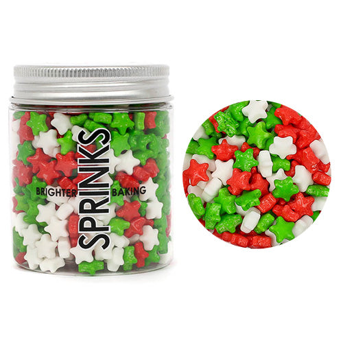 This Christmas Stars Sprinkle Mix by Sprinks includes a mix of green, red and white star sprinkles. Great for decorating Christmas theme cakes, cupcakes & desserts. It is packed conveniently in a 75g wide mouth jar for easy access.