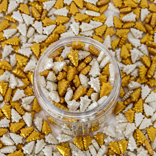 This Christmas Tree Gold & Silver Sprinkle Mix by Sprinks includes a mix of gold and white Christmas tree sprinkles. Great for decorating Christmas theme cakes, cupcakes & desserts. It is packed conveniently in a 85g wide mouth jar for easy access.
