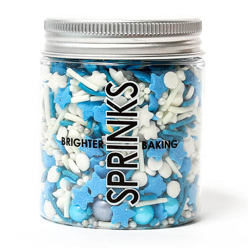 This Sky Full Stars Sprinkle Mix by Sprinks includes a mix of blue, white and grey pearls, jimmies, confetti, star sprinkles. It is packed conveniently in a 65g wide mouth jar for easy access.