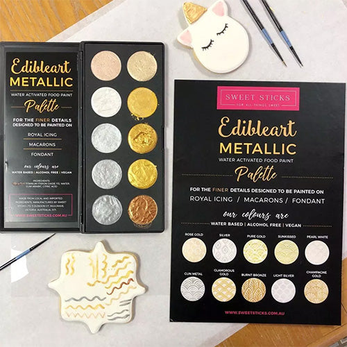 This Metallic Gold & Silver Paint Palette by Sweet Sticks is a 100% edible, alcohol free, vegan friendly metallic palette which is activated by water. To use simply activate w ith water, stir to form paste and paint. When finished, close the lid until next time. It is specifically formulated to cater for the Vegan and Religious Decorators who cannot have alcohol in their cake decorating. Great for achieving fine details on sugar cookies, macarons, royal icing, fondant and more.