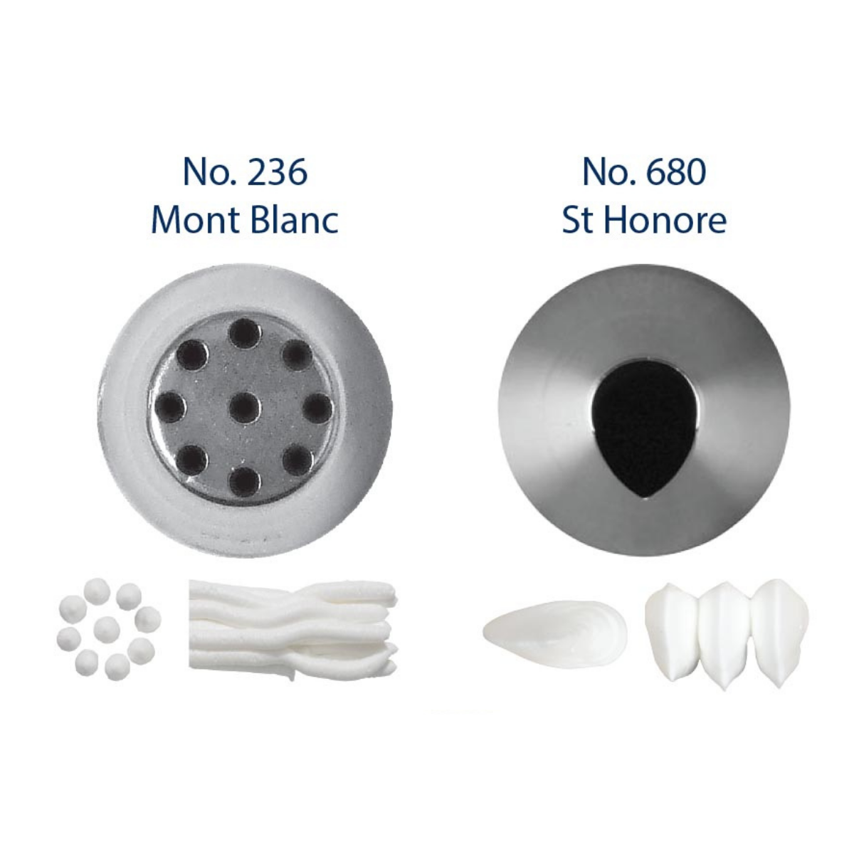 - The St Honore tip is perfect for piping St Honore cakes, whirls, rings and ripples using mousse, tart fillings and icings. The Mont Blanc piping tip is ideal for creating beads, worms, hair/fur or even grass like details. TIP SIZE: Mont Blanc #236 St Honore #680 COUPLER SIZE: Medium Coupler (not included)