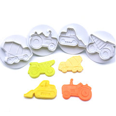 This truck plunger cutter set includes 4 plunger cutters (tractor, mixer, bulldozer & tipper truck). Ideal for use with sugarpaste, rolled fondants, royal icing, gumpaste, marzipan,etc. Measures approximately 60mm.