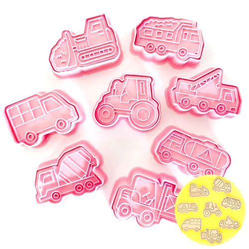 This truck themed cookie cutter and embosser set includes 8 truck cutters and stamps. Use the cutters to shape your cookie, then gently press the stamp into the dough to create imprinted detailing. Cutters measures approximately 5cm wide x 5cm tall.