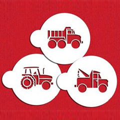 This Trucks Stencil Set by Designer Stencils is a great way to decorate your cookies with dump truck, tractor and tow truck imprints. This set includes 3 stencils (dump truck, tractor, tow truck). Each stencil will fit within a 2.8 inch circle cookie & cupcakes. Stencils are cut on 10 mil food grade plastic for durable repeat use.