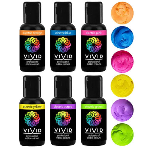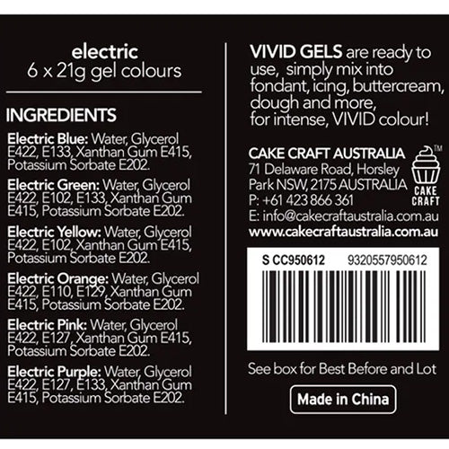 This Vivid Gel Colours Electric 6 Pack includes 6 x gel food colours: